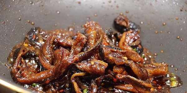 5、鍋中倒入適量的油,油熱將鱔魚放入進去翻炒均勻,炒至變色,然後撒上些許黑胡椒粉;