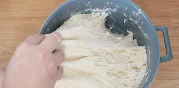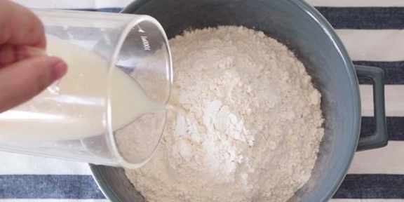 奶黃餡做好後再和麵,準備好的200ml溫水中加入4g酵母、10g白糖,白糖和溫水都能促進酵母發酵,攪拌好的酵母水慢慢倒入麵粉中,邊倒邊攪拌,攪拌成面絮狀,下手揉成一個光滑的麵團,放在一邊醒發至2倍大;