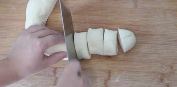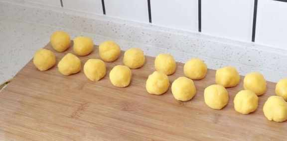 奶黃餡冷藏好之後取出來,將它揉一下,搓成長條,分成大小均勻的面劑子,大約30g每個,這裡的分量一般能分18-20個;
