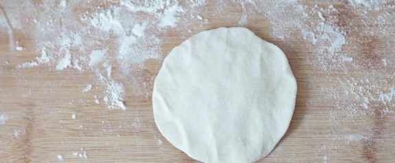所有面劑子都揉圓之後,取第一個揉圓的面劑子,用手掌將它壓扁,光面朝下,壓成中間厚邊緣薄的面皮;