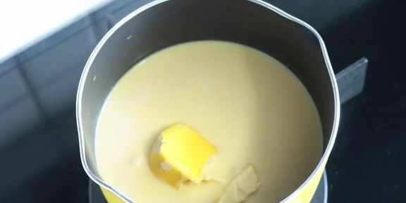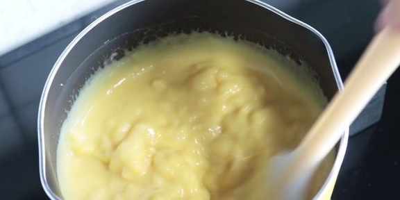 過濾好的麵糊中加入50g黃油,中小火加熱,期間要不停的攪拌,避免糊底;