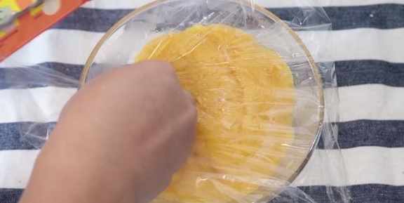 奶黃餡會越來越濃稠,最後煮到奶黃餡能抱團就可以出鍋了,把做好的奶黃餡貼面保存,放冰柜冷藏一小時以上;