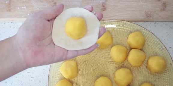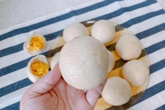 面皮放在手上,把奶黃餡放進去,收口,收口朝下,稍微整理一下,一個奶黃包就做好了,做好的奶黃包放在一邊二次醒發半小時,等體積明顯變大再上鍋蒸;