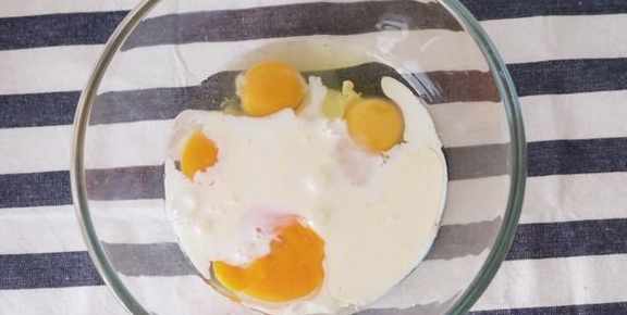 準備好的4個雞蛋打在碗中,加入80g白糖,80g牛奶,80g淡忌廉,淡忌廉能新增奶香味,沒有淡忌廉的全部用牛奶代替,攪拌到白糖融化,雞蛋和牛奶混合均勻;