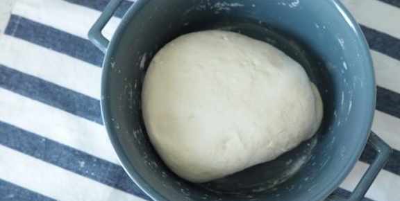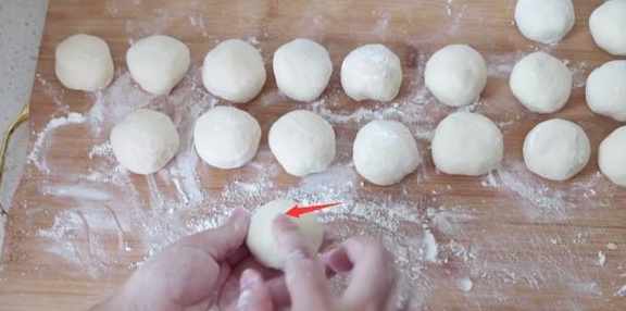 這時候麵團也醒發的差不多了,把醒發好的麵團重新揉搓排氣,分成大小均勻的面劑子,大約35g每個,取一個面劑子,將它重新揉圓,放在一邊,這樣做出來的奶黃包會更加鬆軟有嚼勁,表面也能更加光滑;