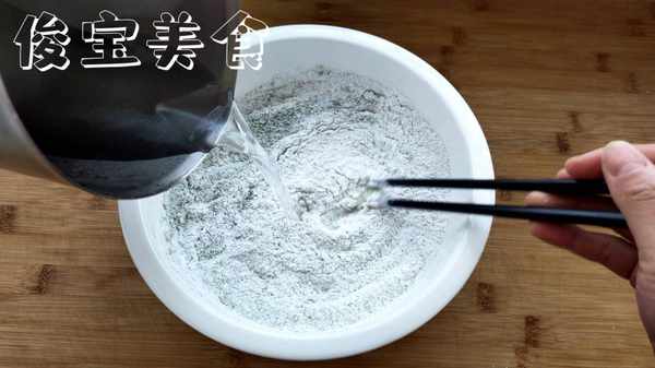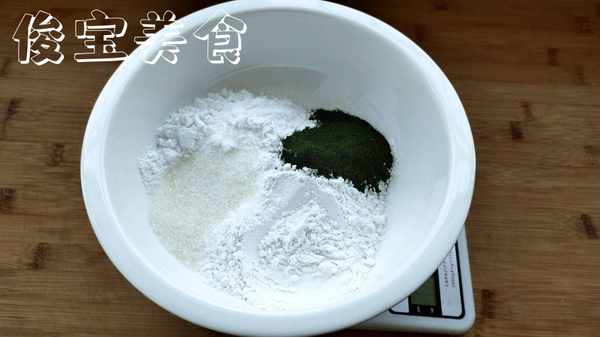① 在盆中加入糯米粉、粘米粉、澄清粉、白糖、艾草粉和艾草粉,可以用菠菜粉代替艾草粉。