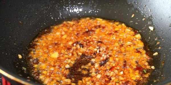 3、鍋中倒入適量油,把蔥白倒入鍋中炸一下,等變成焦黃色以後把調好的醬汁倒入鍋中,等到鍋中冒泡泡以後就可以關火盛出瞭。