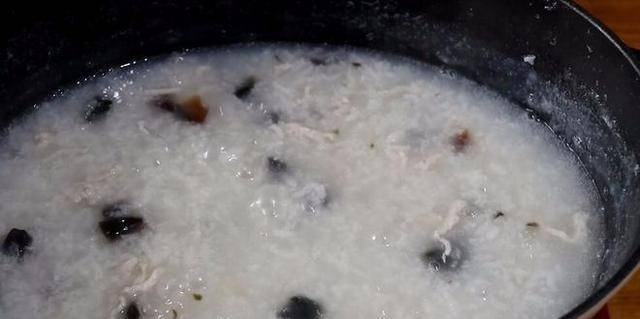 6、等大米煮至濃稠後,把肉絲和皮蛋倒進去,加一點生薑末和適量鹽,攪拌幾下繼續燜煮3分鐘。