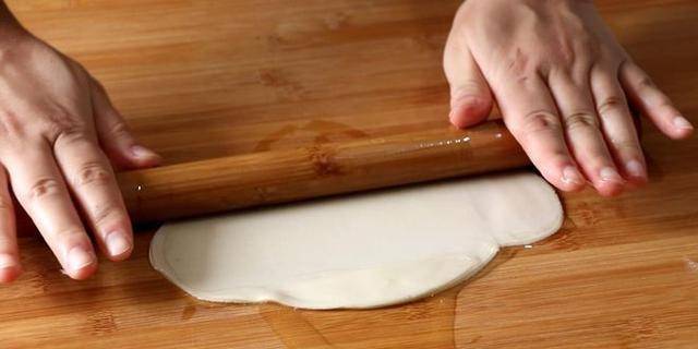 5、用這種辦法搟出三張面皮出來,把它們排列在一起,卷成一個長長的卷以後把它壓扁,用借助搟面杖搟成一塊薄薄的面皮。