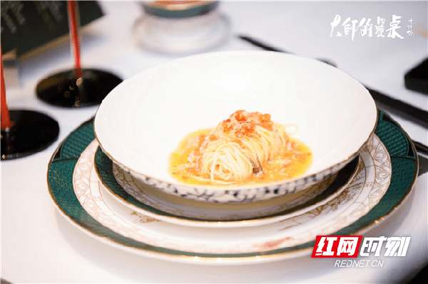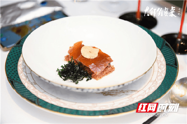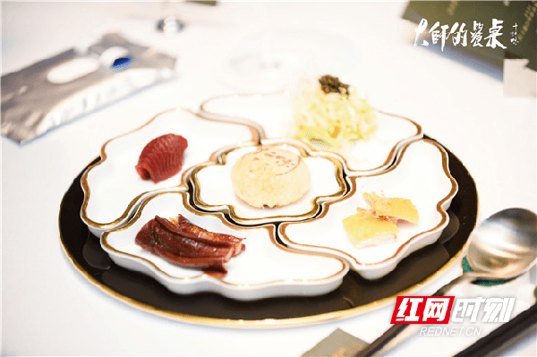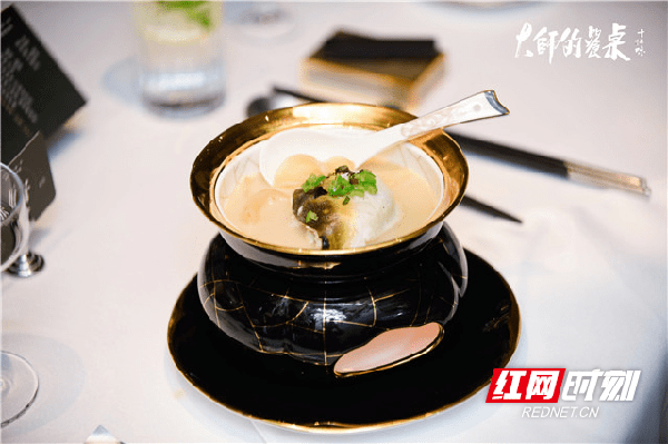 據瞭解,品鑒宴上所使用的食材,有產自湖湘的高端食材,比如:擁有“名貴項雞”之稱的湖南湘黃雞、有“世之名鵝”之譽的武岡銅鵝、有“一兩黃金一兩茶”之說的保靖黃金茶等。也有遼參、魚翅、帝王蟹等傳統高檔餐廳常見的海鮮產品。