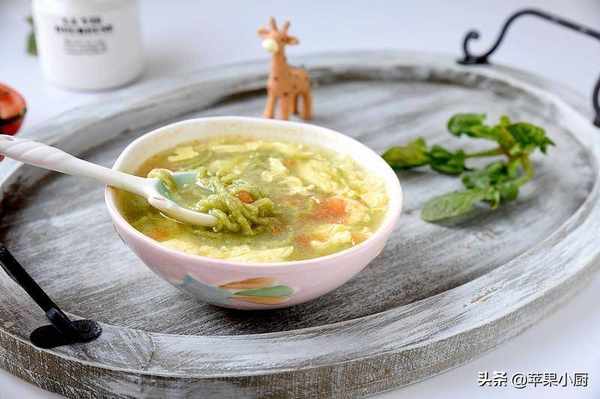 這次我分享的是菠菜、綠色油面條,配上紅色西紅柿、黃色蛋清、湯和主食。它很有營養,可以放在一個大碗裡給嬰兒吃,不含鹽。