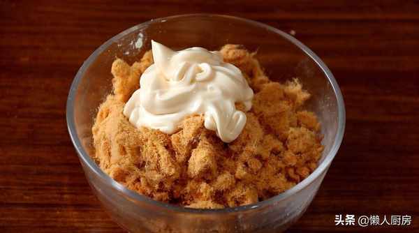 在肉松碗中加入一湯匙沙拉醬,攪拌均勻,揉成球狀。把揉好的肉松餡料分成小塊,揉成小丸子。