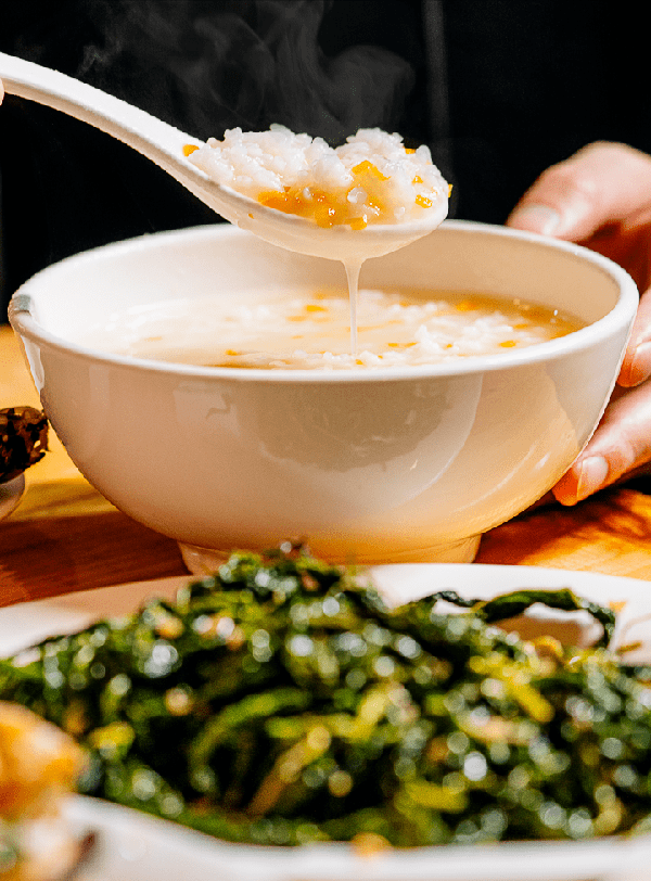 來他傢吃飯,視覺上的盛宴總是比味覺體驗先一步來到。一旁是煮粥區,四鍋齊煮,老板一邊聽著客人的點單,一邊有條不紊地處理著沸騰的粥。另一旁是小吃區,老板娘料理著當傢招牌「炸豆幹」,滋啦啦的油炸聲,催促著老板娘的手速,也刺激著食客的味蕾饞涎欲滴。
