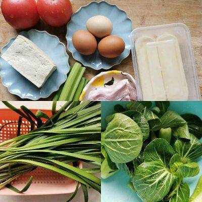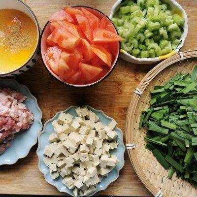 8.加入翻炒的番茄雞蛋湯、韭菜、豆腐和肉醬、芹菜,加入油和胡椒粉,醋就完成瞭!