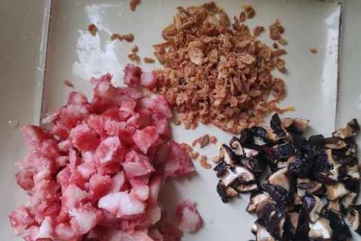 5、在蒸鍋中加水燒開,把兩根廣式臘腸放在籠屜中蒸十分鐘左右,取出晾凉至室溫後將臘腸切成小丁。泡發好的幹香菇擠掉多餘的水分也切成小丁,取三十克海米放到清水中浸泡十分鐘後拿出瀝幹,稍稍剁碎。把備好的小料都放在盤中。