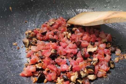 6、把鍋放在爐子上加熱,鍋底熱了以後再放適量的食用油,小火倒入準備好的海米粒、臘腸丁和香菇丁,不斷翻炒直至炒出香味。