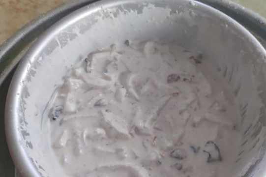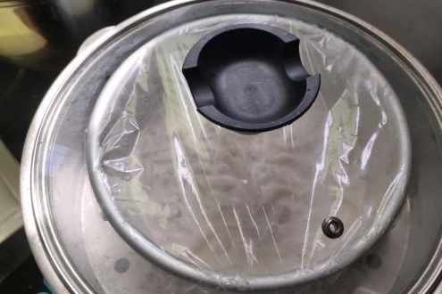 10、在蒸鍋中加水,把攪拌好的蘿蔔糕糊糊鋪一層保鮮膜放在籠屜上蓋好蓋子,調至大火蒸三十分鐘左右,等到糊糊慢慢成形凝固就可以。