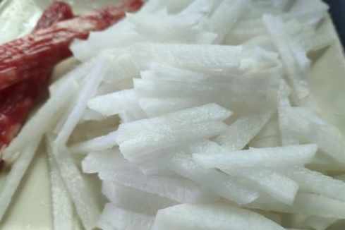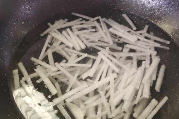 3、在乾淨無油的鍋中倒入適量的純淨水,調成大火燒開放入白蘿蔔細絲,兩至三分鐘左右就可以關火撈出,不要在鍋裏煮太長時間。