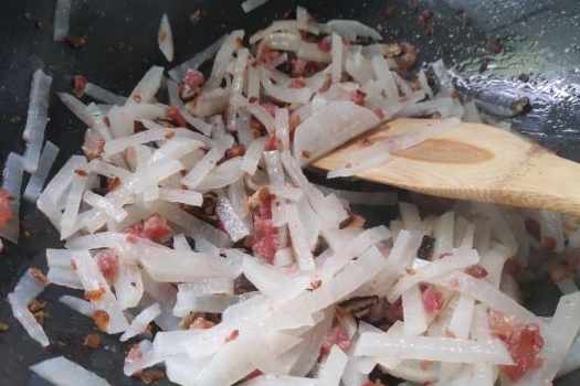 7、炒香小料以後下入瀝幹水分的蘿蔔絲,加適量的胡椒粉、一勺食鹽和一勺蚝油翻炒兩分鐘左右,上色均勻。