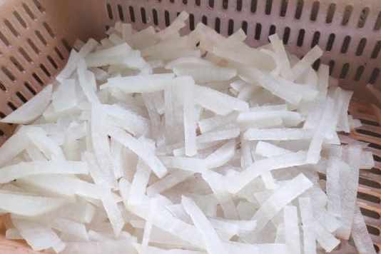 4、把焯好的蘿蔔絲及時撈出,放到能漏水的籃子裏儘量的瀝幹水分,在一旁備用。