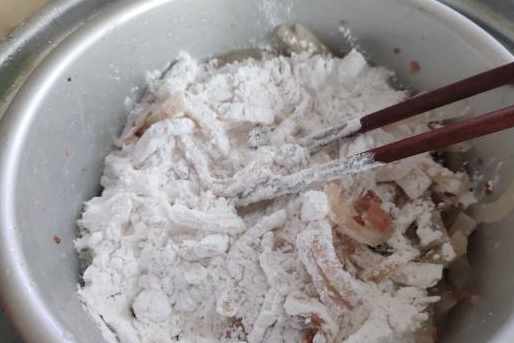 8、把炒香的蘿蔔料盛到盆子裏,加一百五十克左右的粘米粉,用筷子沿一個方向攪拌均勻,還可以帶上手套輔助抓拌,一定要在表面全部裹上粘米粉。