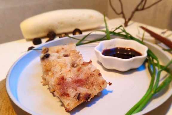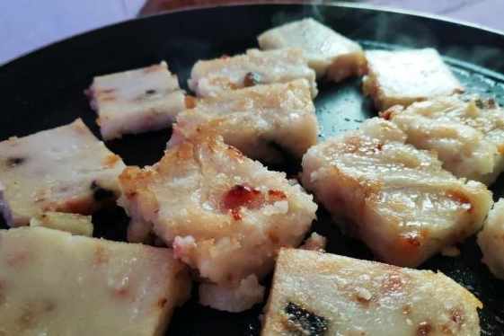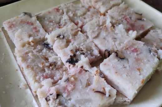 11、蘿蔔糕蒸好之後及時打開蓋子取出,晾凉至室溫後切成小方塊備用。