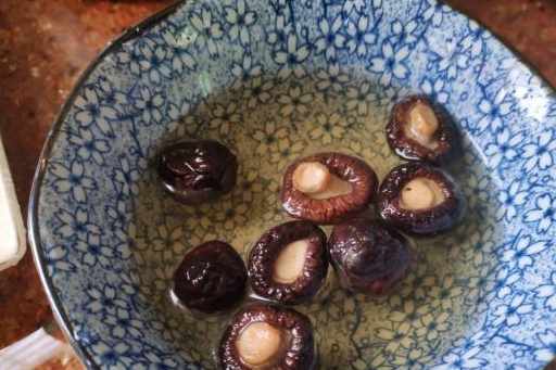 1、在大碗中裝入適量的清水,放入八到十顆幹香菇,提前進行泡發。準備其他臘味蘿蔔糕所需要的食材。