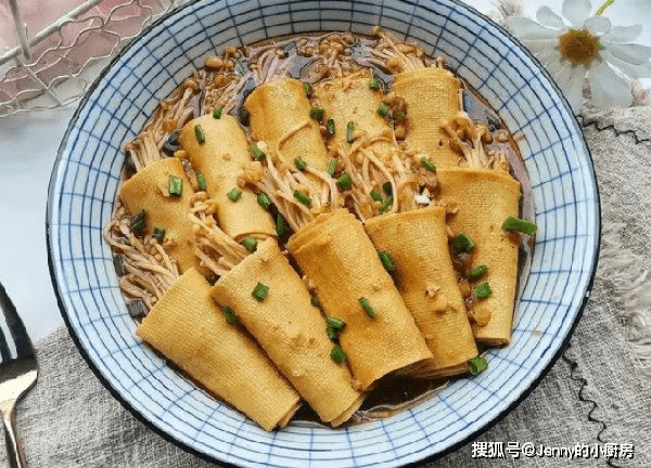 豆腐皮清洗幹凈,切成長方形小塊。金針菇去掉根部,清洗幹凈。