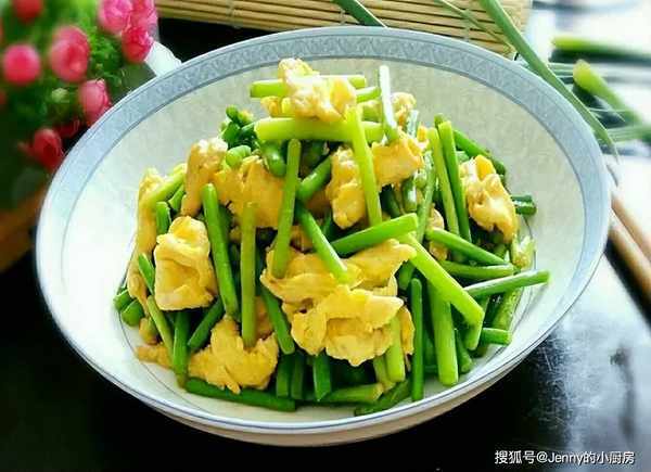 鍋內加油,燒熱後倒入蛋液,炒成小塊盛出,再倒入蒜薹翻炒。
