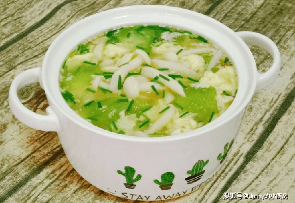 最後淋入蛋液,煮成蛋花,再加鹽調味。出鍋後撒些蔥花,這道菜就做好瞭。