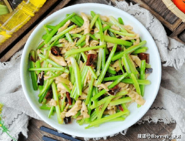 熱鍋涼油倒入肉絲滑炒,炒到變色盛出。留底油放入蔥薑、幹辣椒爆香,再倒入芹菜翻炒,炒到斷生。