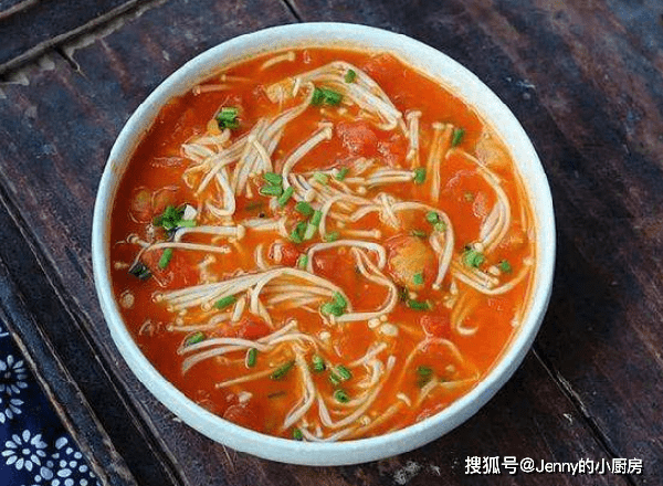 番茄清洗幹凈,入鍋煮兩分鐘。金針菇切掉根部,清洗幹凈。