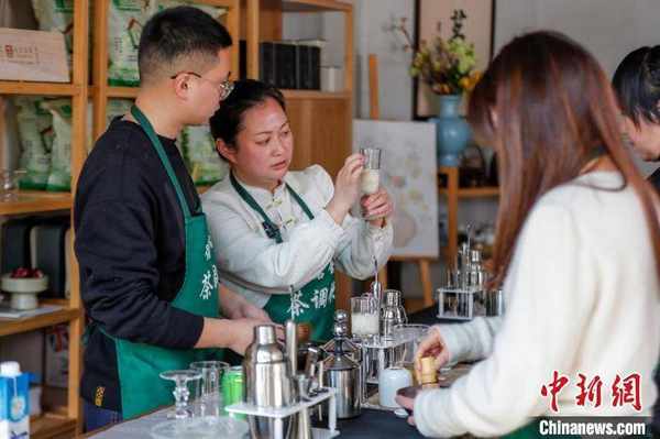 在黃山市德茗舍茶藝職業培訓學校,非遺項目徽州茶道代表性傳承人汪蓀正在教學員制作“新中式茶調飲”。“現在做的這款茶飲名叫‘北海新綠’,茶底是太平猴魁,純茶萃取而成,中間部分加上當地風味——靈山酒釀,再覆上奶蓋,裝飾一朵櫻花配上薄荷葉,一杯新中式茶調飲就好瞭。”
