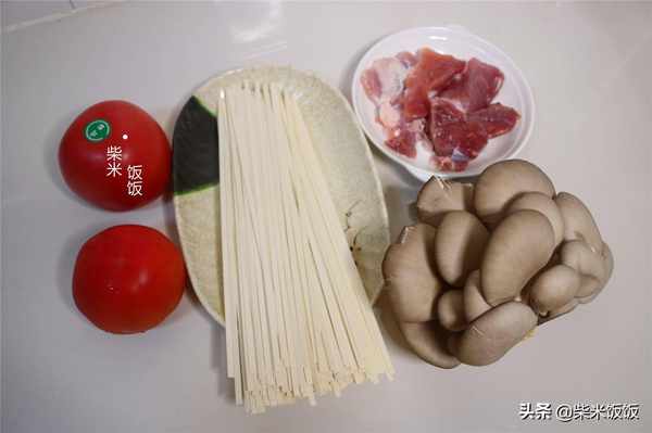 【配料】面條、西紅柿、蘑菇、豬肉、蔥、薑、大蒜、老抽、生抽、鹽