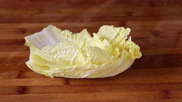 2.首先,我們來處理卷心菜。切掉卷心菜的根部,然後從上面掰下幾片葉子,大約4到5片。把卷心菜葉子放在幹凈的水中稍微沖洗一下,或者你可以避免沖洗,因為裡面包裹的卷心菜葉子相對幹凈。然後把它切成更細的條狀,放在盤子裡待用。