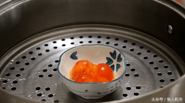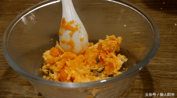 先把咸蛋黃放在鍋裡蒸,然後用勺子把它搗碎,做成糊狀。加入肉末和沙拉醬,攪拌均勻,形成綠色的面團餡料。