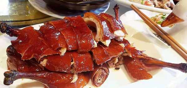 3.用幹松毛繩將鴨爐燒熱至70~80℃,見無煙時用火鏟將松毛炭扒平;每鴨下方放1土碗(接鴨油用)、鴨子從上爐口放入掛好,蓋上蓋子;每燒10分鐘左右,打開蓋子翻動一次,先烤背、後烤腹,刷上油,使火色均勻;燒的時間根據鴨肉的老嫩來掌握、30分鐘左右可熟。出爐後,拔去肛門蘆葦桿,控出肚內湯汁,從中間剖成兩半,斬成長方塊、擺入盤中,保持鴨形,與花椒鹽、大蔥頭、水蘿卜、芝麻醬、甜面醬一同上桌。特點光亮油潤,色澤紅艷,香脆鮮嫩,清香離骨。