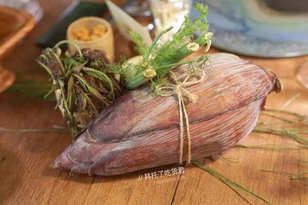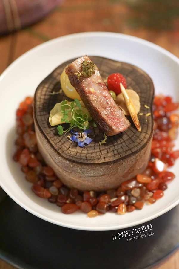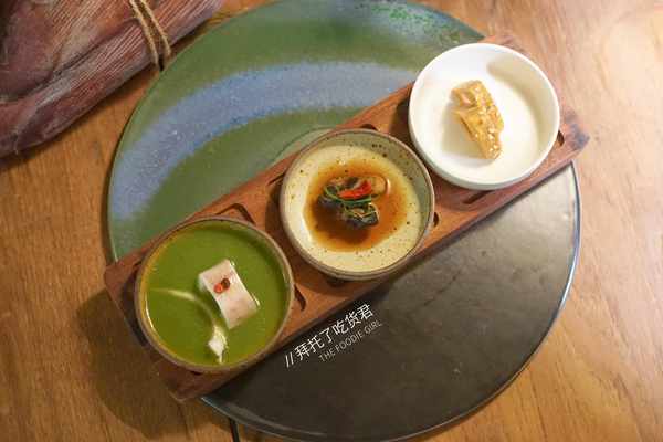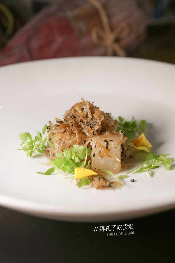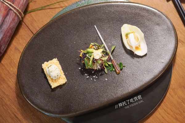 柴火豆腐點綴來自晉寧區麟趾坡300年紅椿樹上采摘的紅椿,日本北海道貝柱,淋上由雲南山葵、酸木瓜水等調和而成的酸辣芥汁,隻生長在建水縣的草芽,彎曲成柔美造型,疊加雲南百香果、紫蘇,仙氣飄飄。