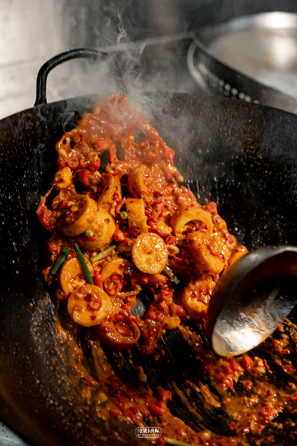 在湖南有著“發財”寓意的金錢蛋,是店裡點單率的top1。白水煮蛋橫刀切成大片,經過油炸後換上瞭一層金黃的虎皮外衣,口感脆韌,但不難嚼。2次下鍋時給到湖南辣椒面,是往這道菜裡註入的靈魂,口味酸辣辛香,配著飯吃嘎嘎香。