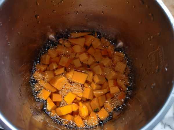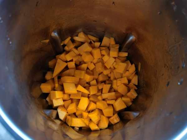 把所有南瓜丁放入豆漿機中。南瓜一定不要切大塊,大塊豆漿機中放不了幾塊,打出的南瓜汁也就不濃稠。