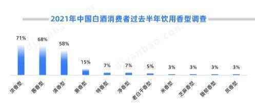 洞見研報的數據則顯示,“2021年中國白酒消費者過去半年飲用香型”前三名毫無懸念地花落濃香型、醬香型、清香型,其餘分別為兼香型、特香型、凈香型、老白幹香型、米香型、芝麻香型、馥鬱香型、鳳香型。其中除瞭凈香型,其餘均為十二大香型。