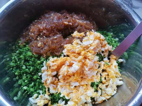 第三步:把茴香碎放入盆裏,雞蛋炒成雞蛋碎放入,調拌好的粉條放入。