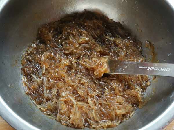 第二步:粉條用開水煮開,浸泡至發軟,撈出控幹水分,加入醬油拌勻上色,再加入花生油拌勻。