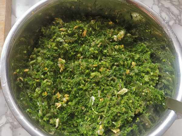第一步:茴香苗洗淨切碎備用。在這裡我們先來說說茴香苗吧,很多人沒有吃過,茴香苗有一股清香氣味,而且營養豐富,含有豐富的胡蘿蔔素、鈣以及豐富的維他命等。茴香油還有止痛和一定的抗菌作用,是天然的抗生素。鮮嫩的茴香苗經常用來蒸包子,包餃子,炒,做湯等等,有健胃祛濕、行氣,散寒止痛等作用,可以說濕氣就怕它,常吃對於身體來說好處多多。做餡蒸包子比白菜韭菜好吃多了遇到了別錯過哦。