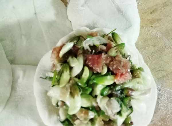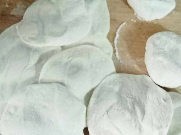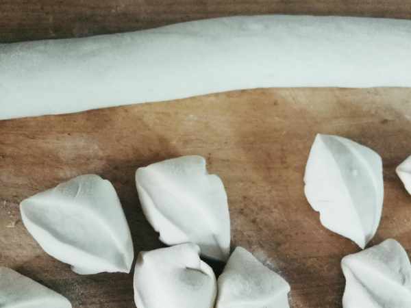 6、把面團搓條切成小塊搟成圓的,包入餡;