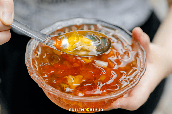 冰涼粉,可以說是桂林人的簡約版清補涼,沒有多餘的各種小料,就是“凍凍”加紅糖水,想要涼上加涼就放一些白醋,用牙簽蘸一點薄荷,更透心涼心飛揚。