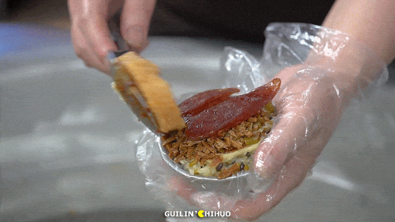 給桂林人一個糯米飯就可以團下全世界,粉蒸肉、扣肉、雞排、妙脆角……一層不夠還能壘兩層,要確保一口下去能吃到所有料,拍扁瞭,張大嘴!
