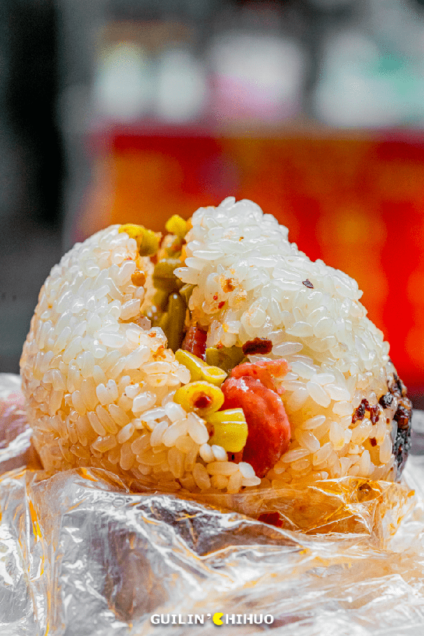 拳頭大小的飯團,花一樣形狀的“脆脆”是靈魂,還夾著酸菜、火腿、香腸、丸子、豆腐絲、豆蓉等配料,愛吃辣的必須再來一勺辣椒醬。