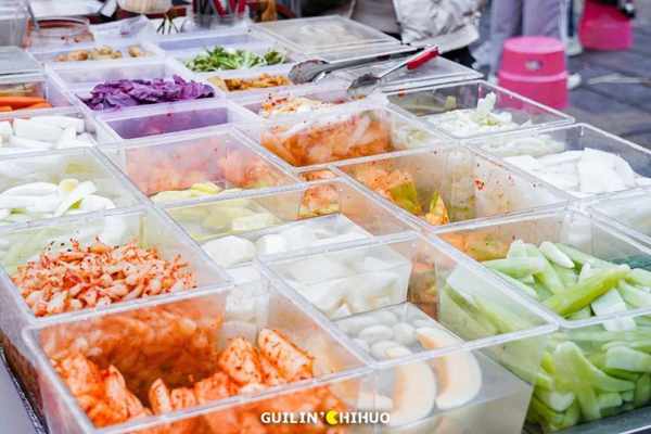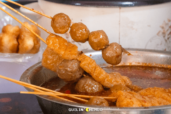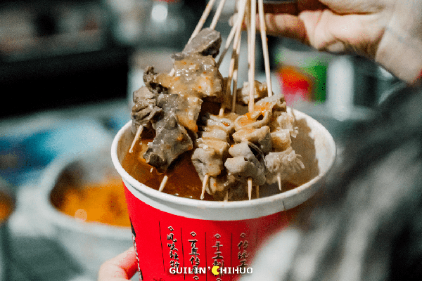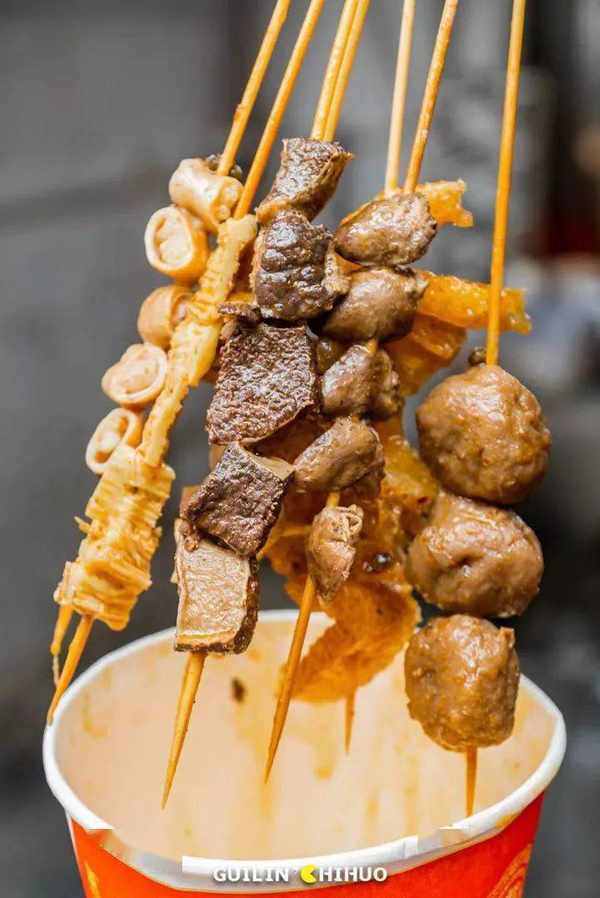對於桂林人來說,用簽子穿起來泡在湯裡煮的,都可以稱為“串串”。比較普遍的就是麻辣燙,葷素搭配來幾串,再煮一碗粉絲,暖呼呼又過癮的一餐就搞定瞭。