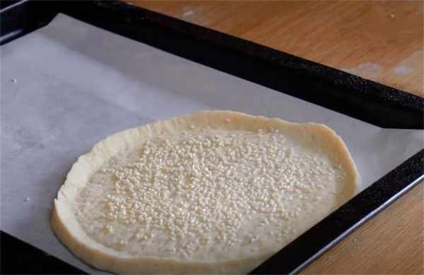 6.表面刷一層清水,再撒一些白芝麻上去,這樣一個生胚就做好瞭。
